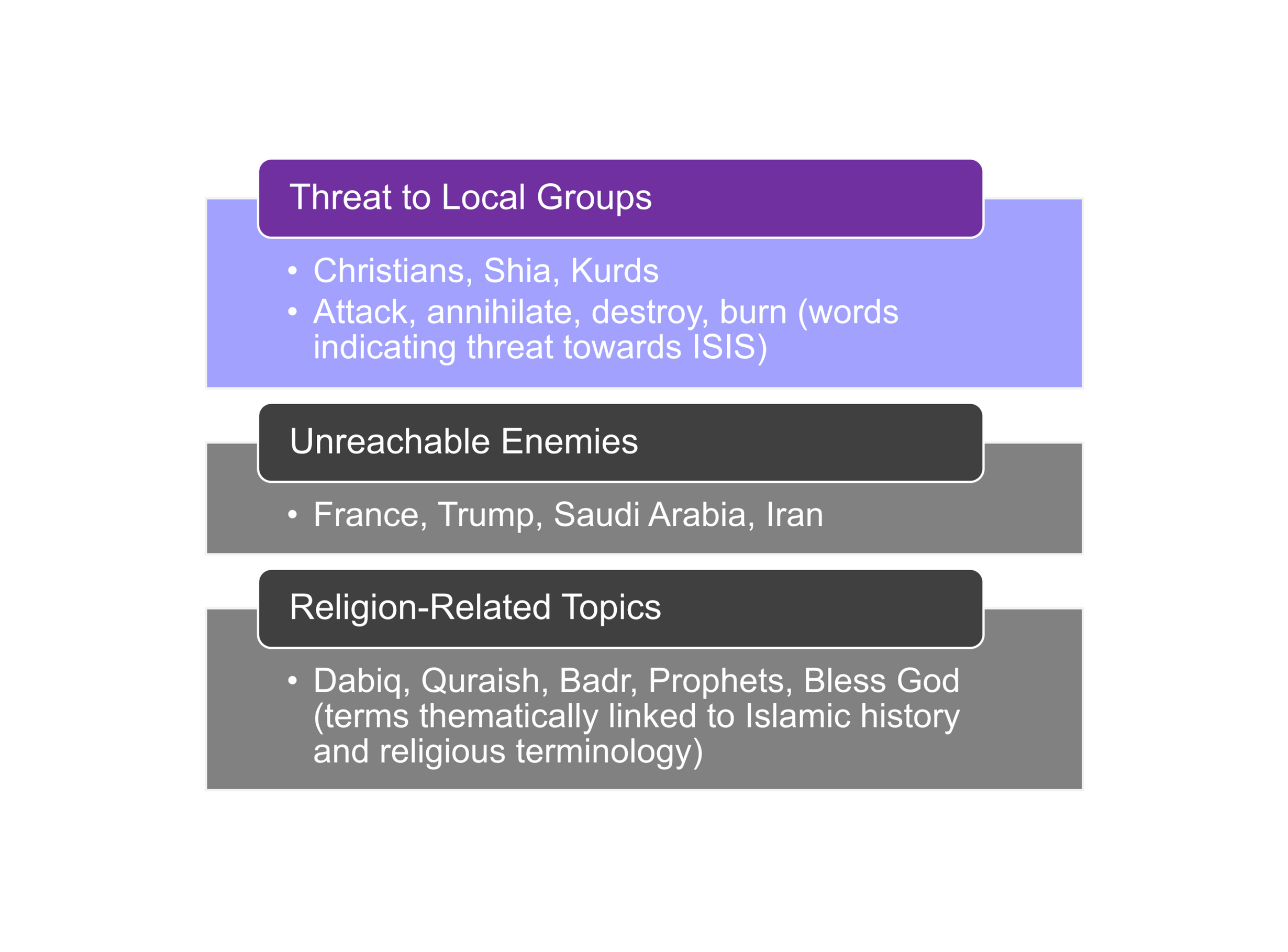 Main Findings:> Threats to local groups, which comprises use of words indicating threat with Christians, Shias, Kurds (and more) are most highly and positively correlated with actual ISIS attacks.> Topics concerning religion and unreachable enemies indicate negative and less significant correlation with ISIS attacks.> This indicates that fear, not hatred or religion, drives ISIS targeting. This can offer actionable insights for security strategies.